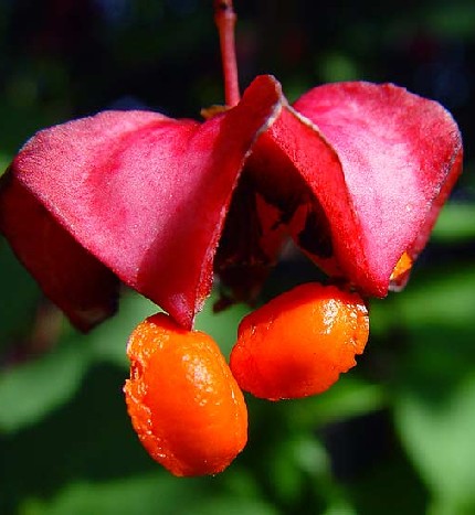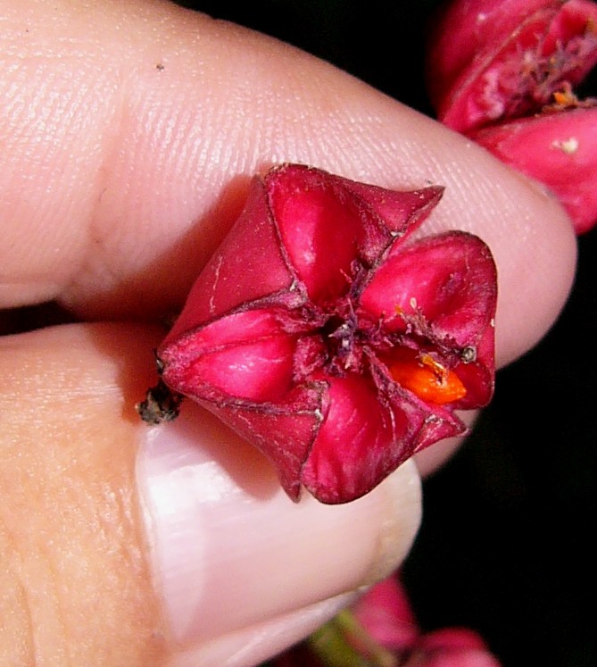 Früchte öffnen 4- klappig, jedes Fach entält 1 Samen, welcher von einem orangeroten Samenmantel (= Arillus) umgeben wird