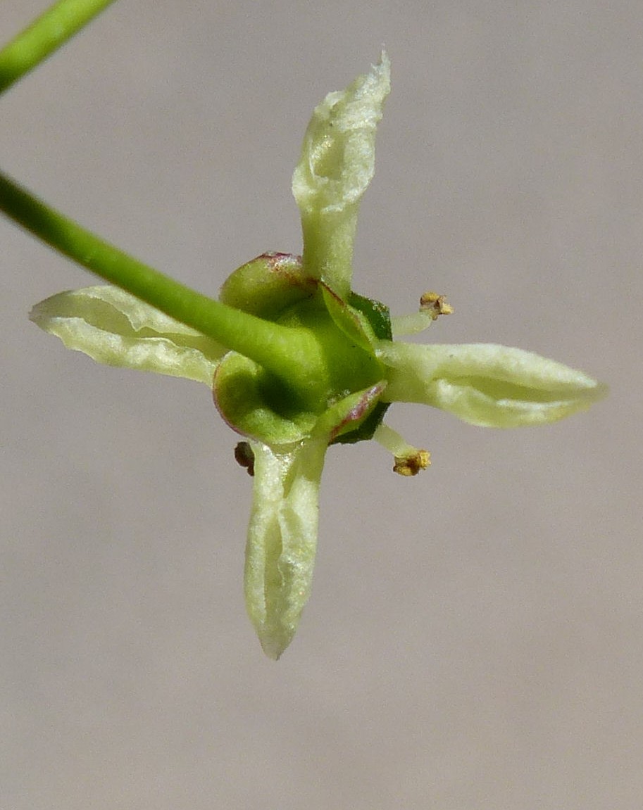 Blüten mit 4 grünlich- weißen Kronblätter, 4 - 5 Staubblätter, Antheren gelb, Fruchtknoten oberständig, mit kurzem Griffel und winziger Narbe