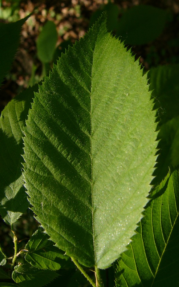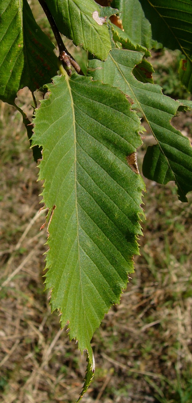 Blätter +/- eilänglich, 4 - 10 cm lang, doppelt gesägt, mit 11- 15 Blattnerven, Blattgrund abgerundet, Blattoberseite kahl oder spärlich behaart Blätter lang zugespitzt, unterseits auf den Nerven behaart