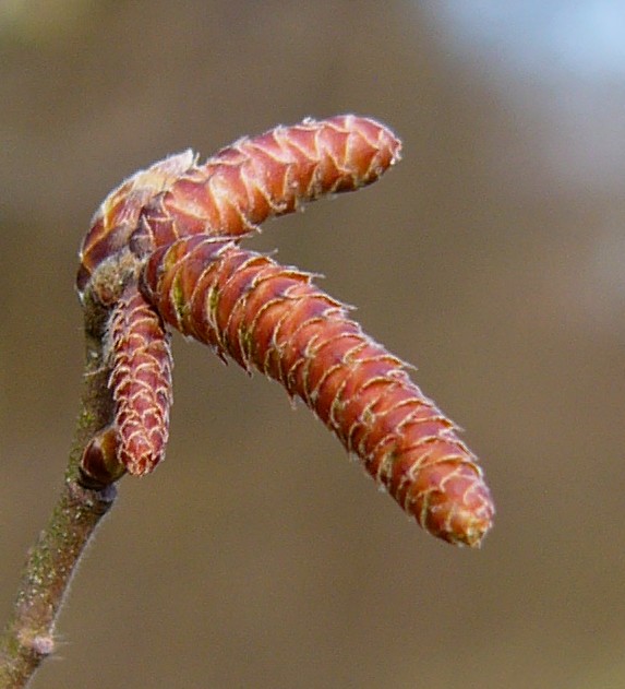 Weibliche Kätzchen kürzer als die männlichen, im knospigen Zustand überwinternd, weibliche Kätzchen mit 6 - 24 Blüten, jeweis 2 Blüten in den Achseln eines bald abfallenden Tragblättes, Fruchtknoten von einem lang behaarten Vorblatt verhüllt, nur die roten Narben herausragend