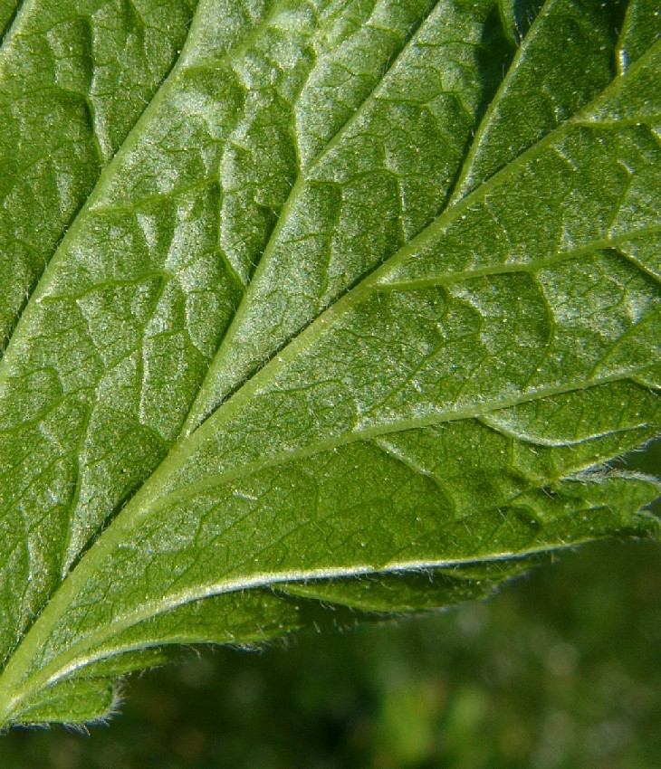 Blätter von den Elternarten deutlich abweichend: aus stark herzförmiger Basis rundlich, meist bis etwa 6 -7 mm lang und breit, gewöhnlich nur seicht 3 -, selten bis 5—lappig mit überwiegend nur zu einem Fünftel oder Viertel (also viel weniger als bei den Eltern) eingeschnittener Spreite, gekerbt, oberseits glänzend, +/- kahl,