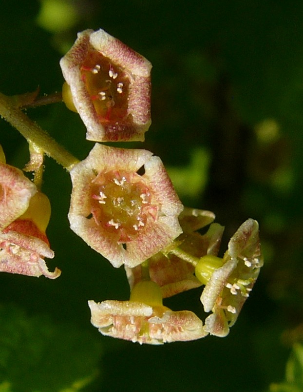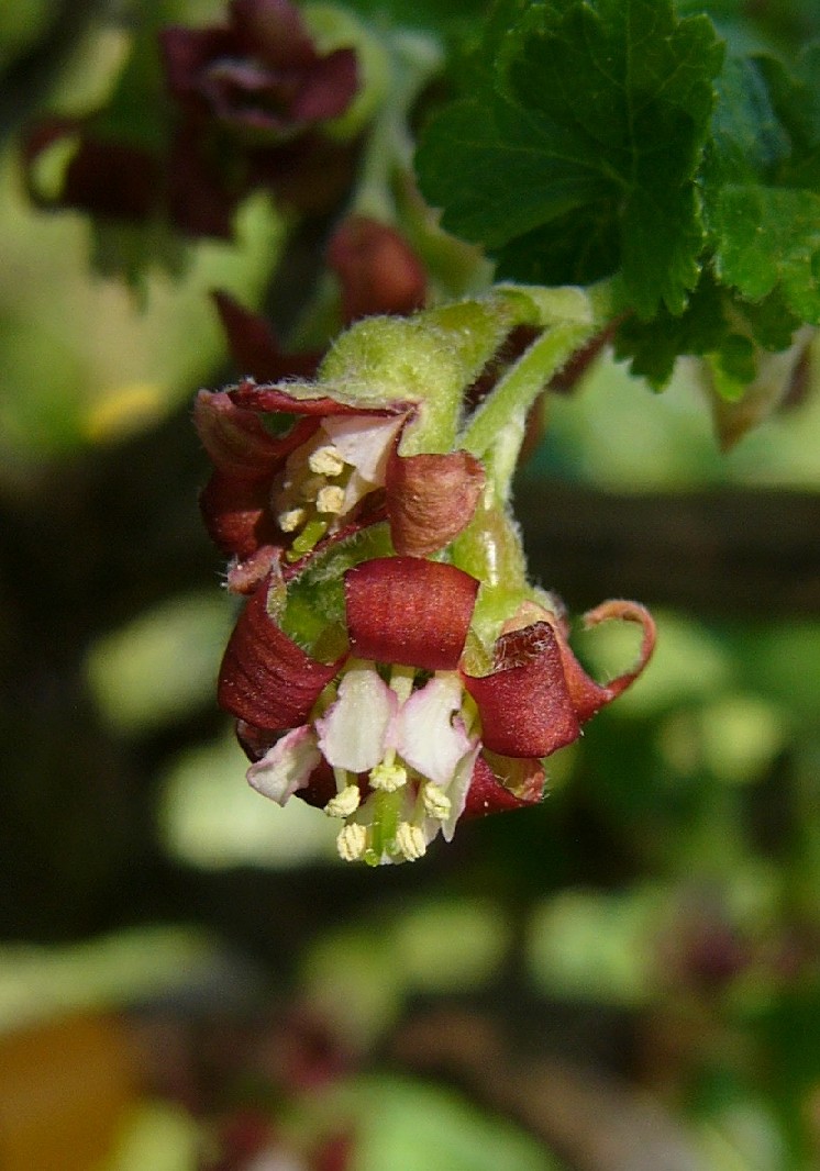 innen rotbraun außen grün Kelchzipfel lang, ausgebreitet oder umgerollt Kelchröhre glockig, Kronblätter weiß > Josta- Beere