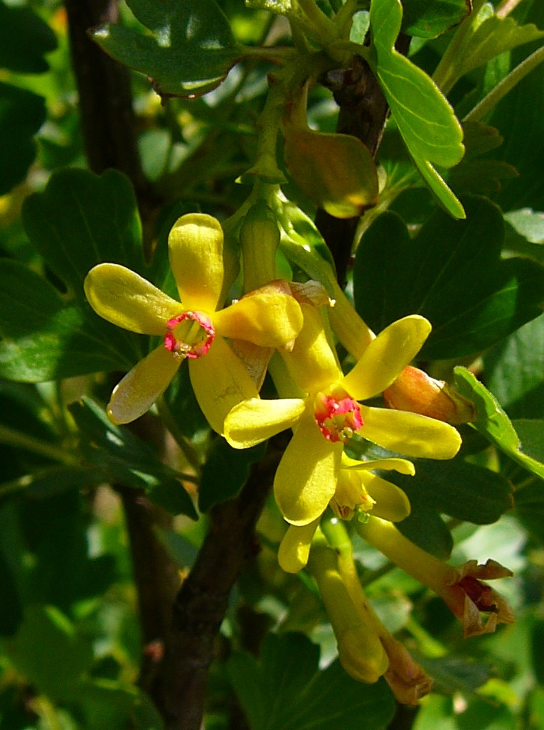 goldgelb, Kelchzipfel lang, ausgebreitet Kelchröhre lang, schlank, Kronblätter rot > Ribes aureum
