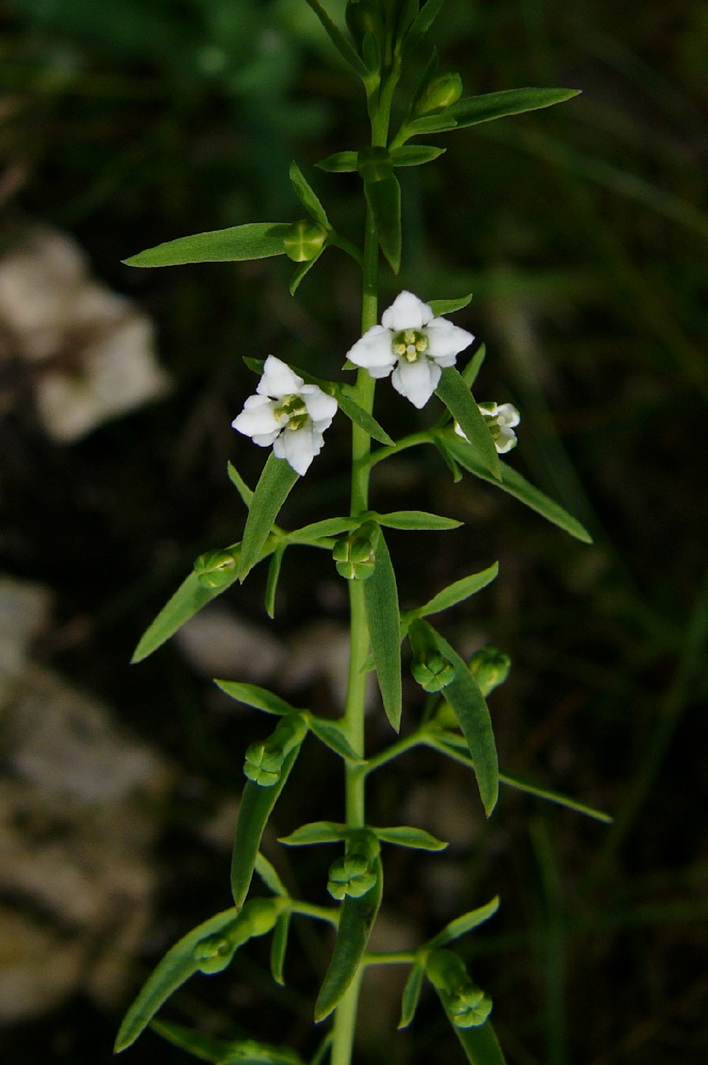 Thesium - Pflanze kahl, Blüten mit 4 Perigonzipfeln, von 3 Hochblättern umgeben