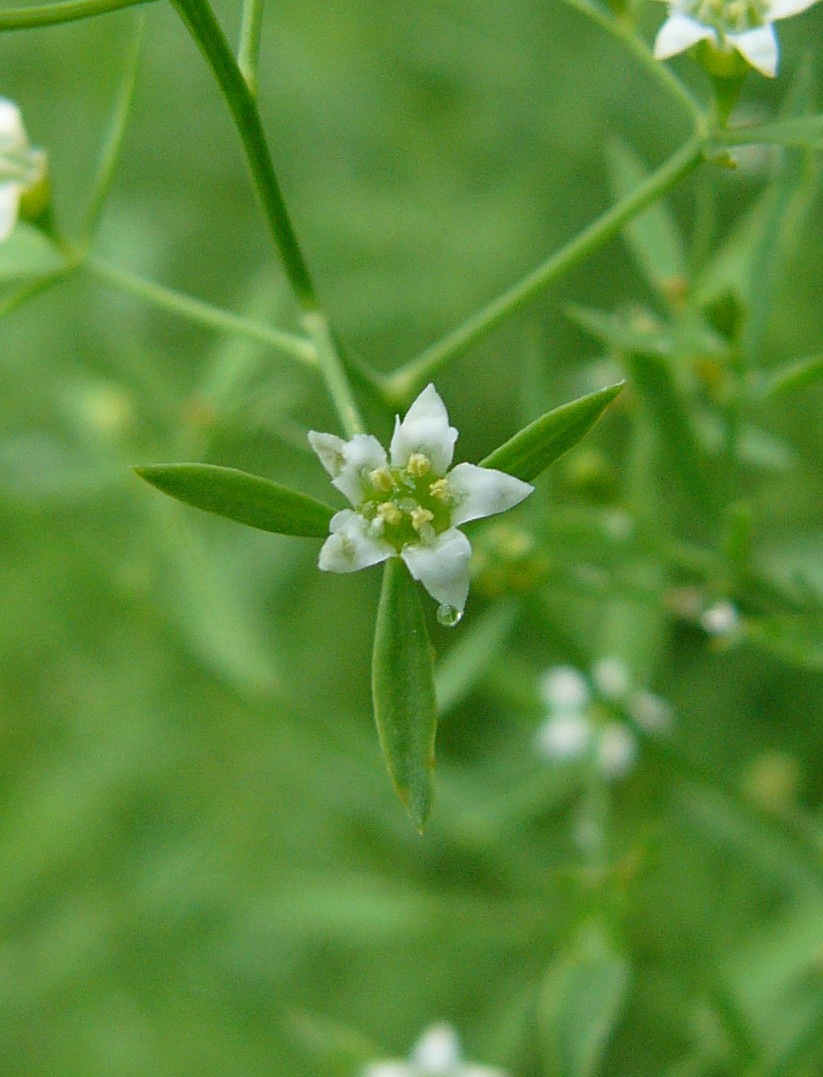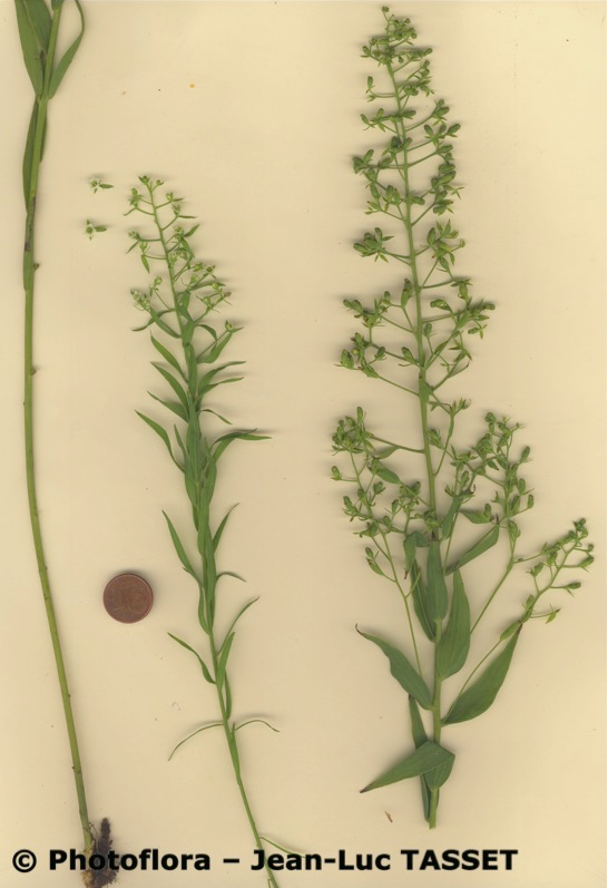 Thesium - Pflanze kahl, Blüten mit 5 Perigonzipfeln, von 3 Hochblättern umgeben, Blätter breit