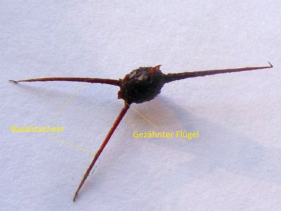 Frucht 3-kantig, zwischen den Basalstacheln mit (oft gezähntem) Flügel, Stacheln am Grunde verbreitert, seitlich zusammengedrückt, viel länger als Frucht, mit kleineren Stacheln dazwischen