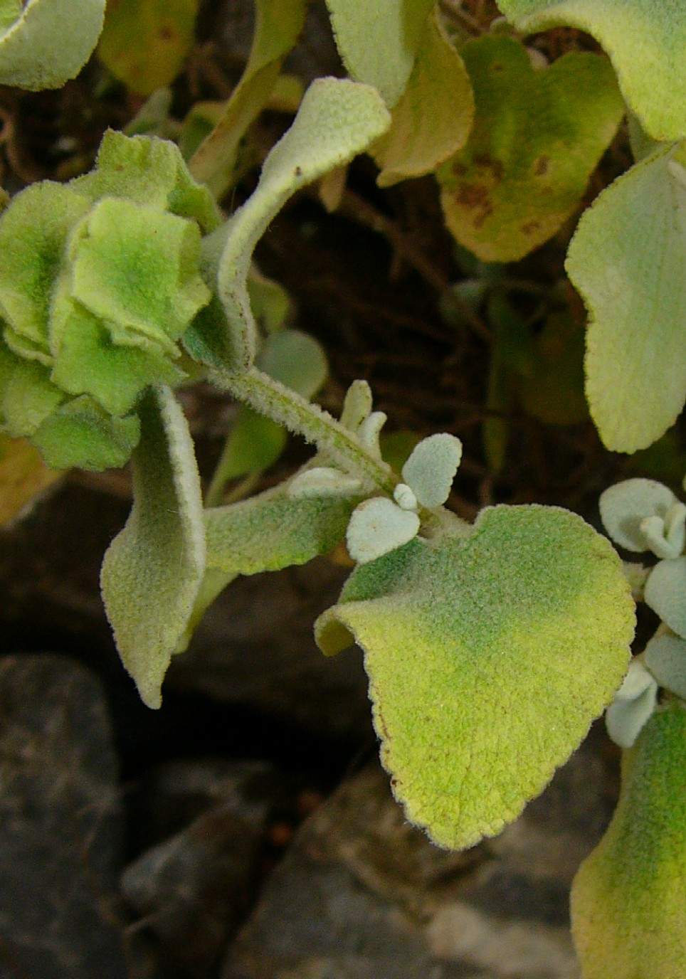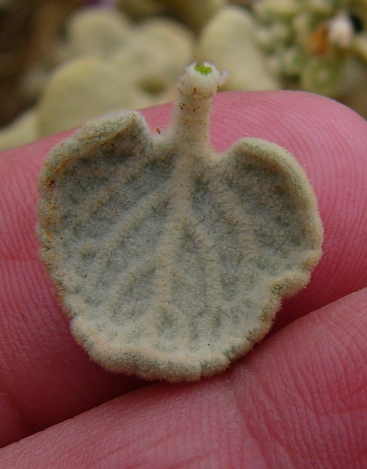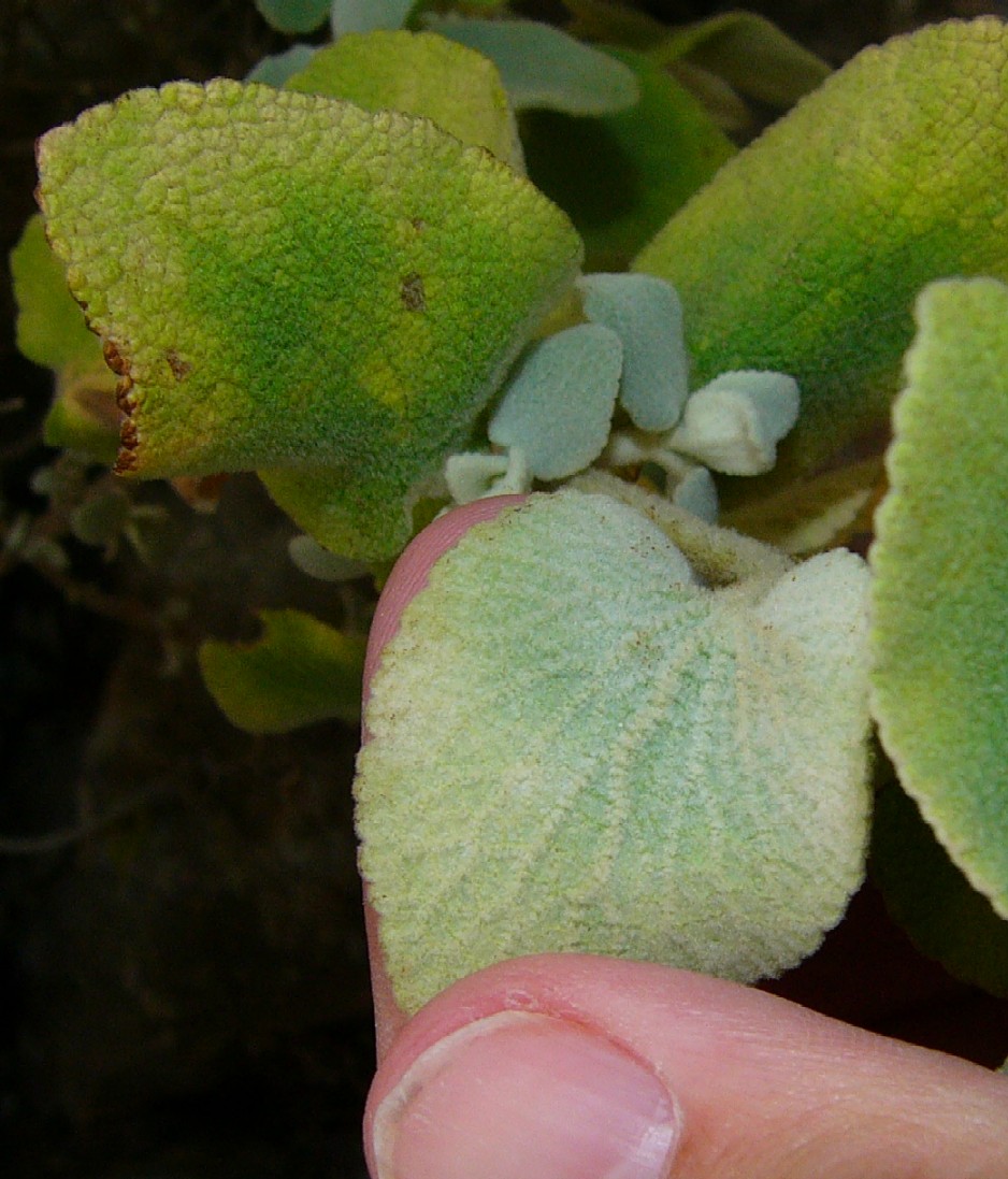 Blätter rundlich, 20 - 30 mm lang, +/- ganzrandig, bleibend dicht weißwollig