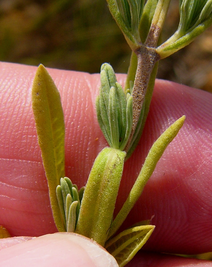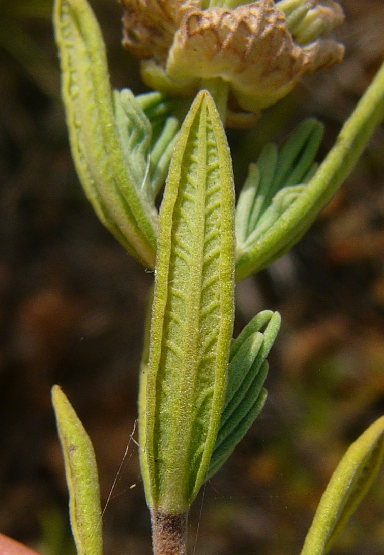 Blätter schmal linealisch, 10 - 40 mm breit, ganzrandig, jung grau filzig mit Blattbüscheln in den Achseln am Rand umgerollt, mit deutlichen Seitennerven