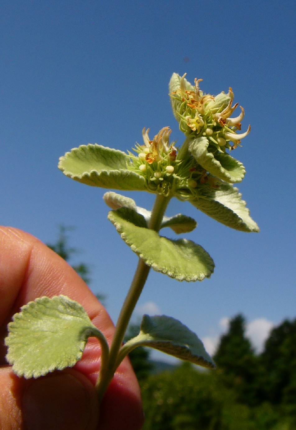 Blätter rundlich, gekerbt, beiderseits seidig filzig, mit gelblichem Indument