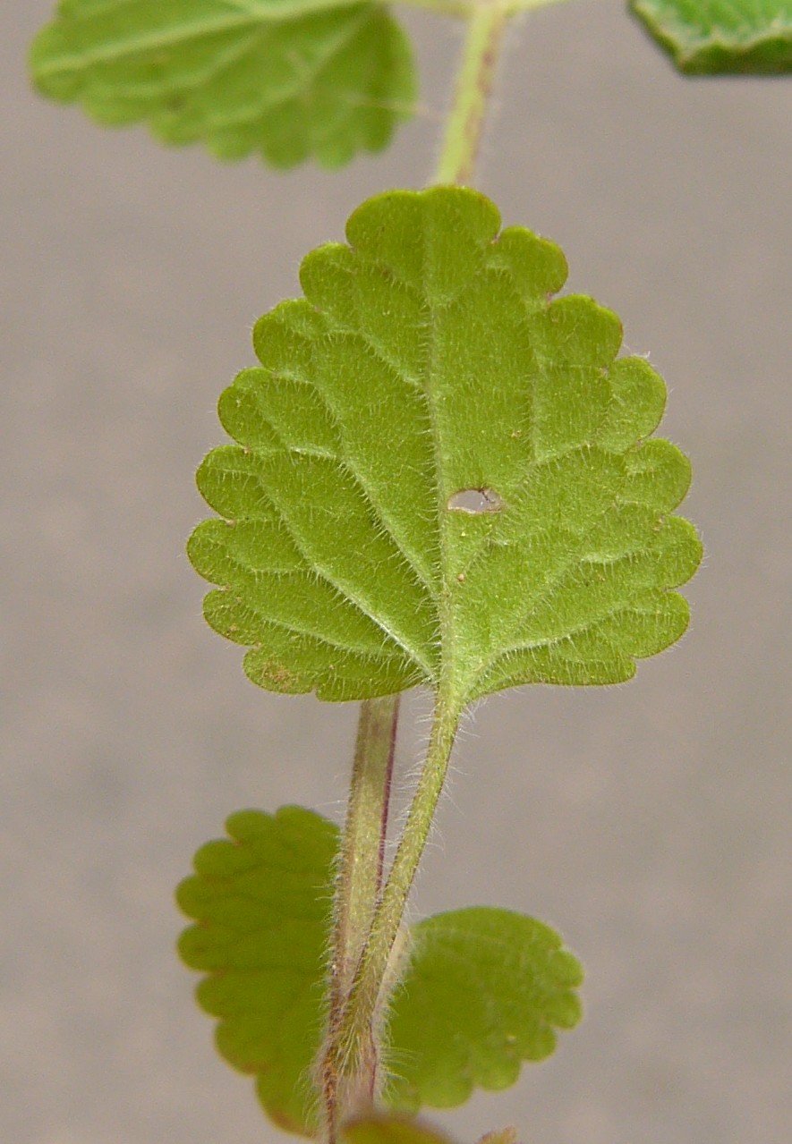 Blattspreite 12 - 16 mm lang, rundlich dreieckig, am Grund gestutzt, herzförmig oder keilig