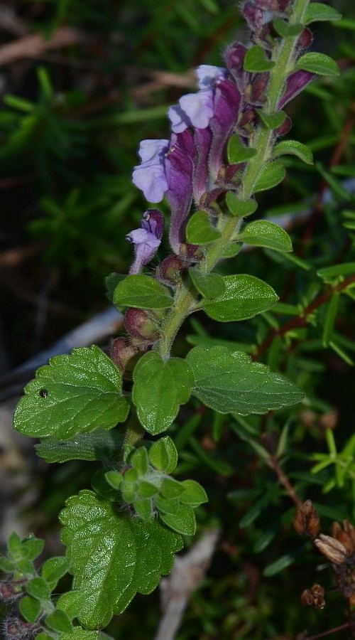 Endemit des Taygettos Pflanze kriechend, 10 - 15 cm groß, Blütenstand 6 - 20 cm lang, Kronröhre und Oberlippe dunkelviolett, Unterlippe weiß oder hellviolett, sehr breit > 2