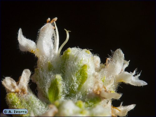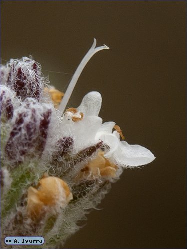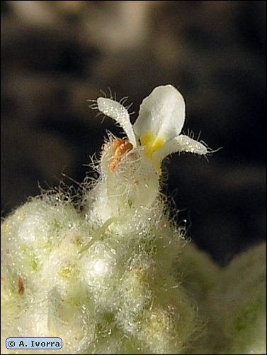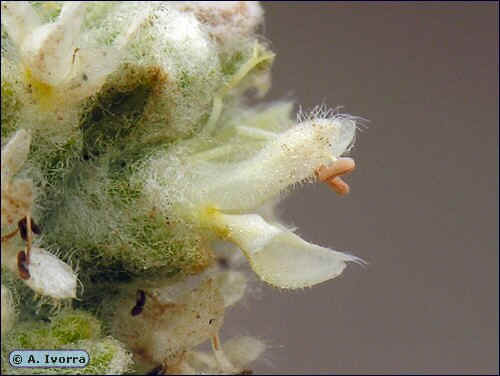 Blüten 8 - 9 mm, cremeweiß, Seitenlappen der Unterlippe klein, +/- dreieckig, kahl, so groß wie die Reste der Oberlippe, Mittellappen ca. 2 mm lang, 1 mm breit