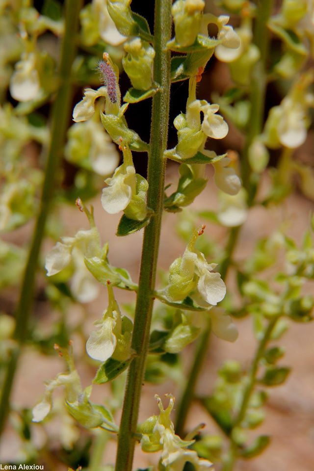 Kelch 2- lippig, angedrückt behaart, Kelchblattzipfel ungleich, oberster Kelchblattzipfel eiförmig, deutlich länger als die 4 seitlichen und unteren Kelchblattzipfel, in einen Dorn auslaufend, zur Fruchtzeit zurückgebogen