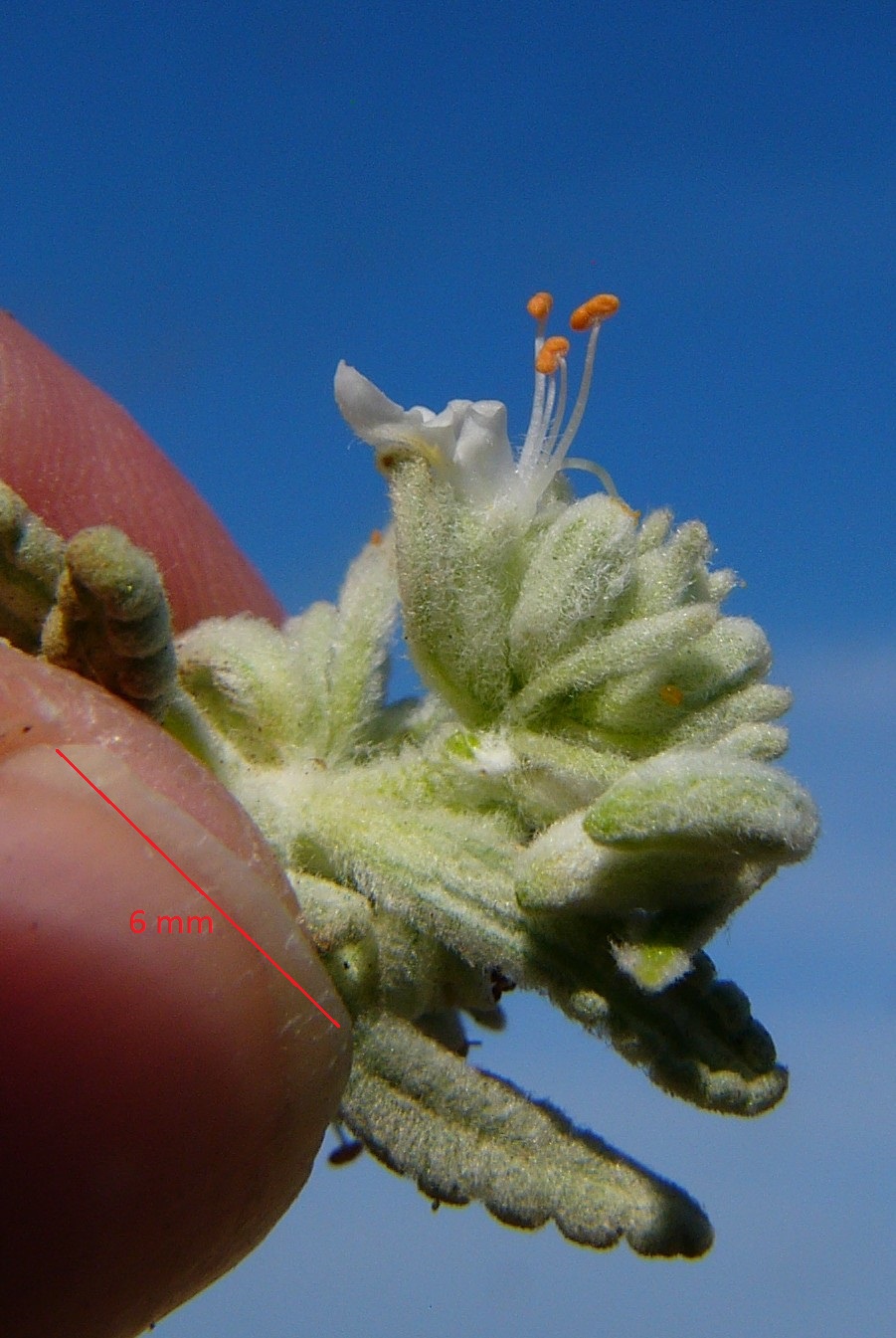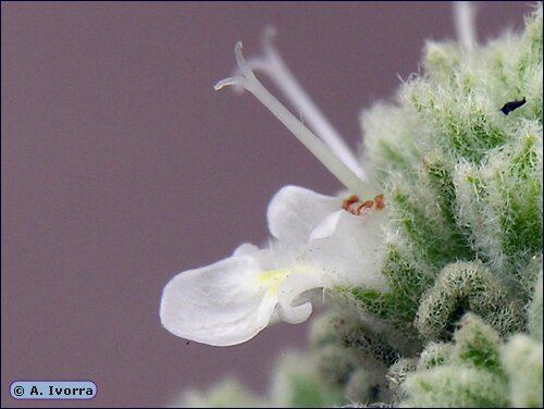 Blüten 6 - 7 mm, weiß, Reste der Oberlippe ca. so groß wie die Seitenlappen der Unterlippe, Kelch 4 mm, mit langen, verzweigten Haaren, Kelchzähne flachdreieckig, mit 1 mm langer Stachelspitze