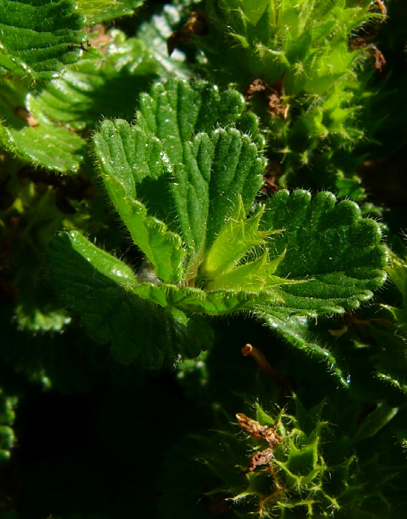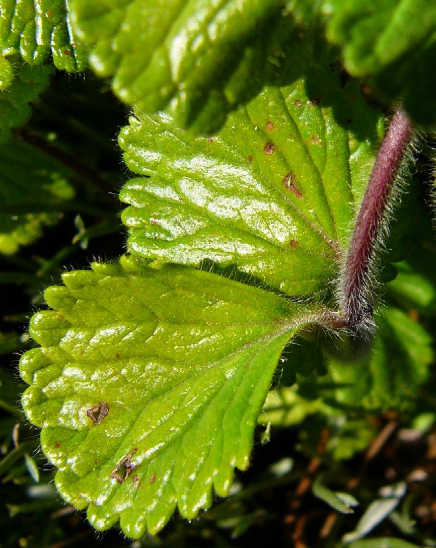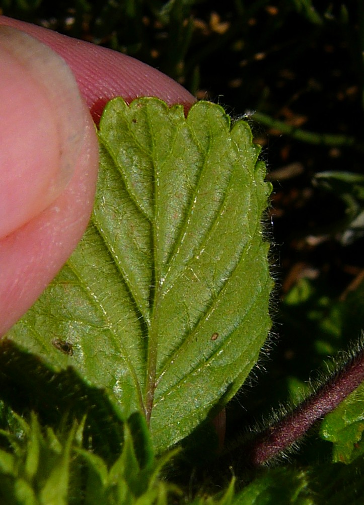 Blätter eiförmig, gestielt, gekerbt, 6 - 7 mm im Durchmesser,
