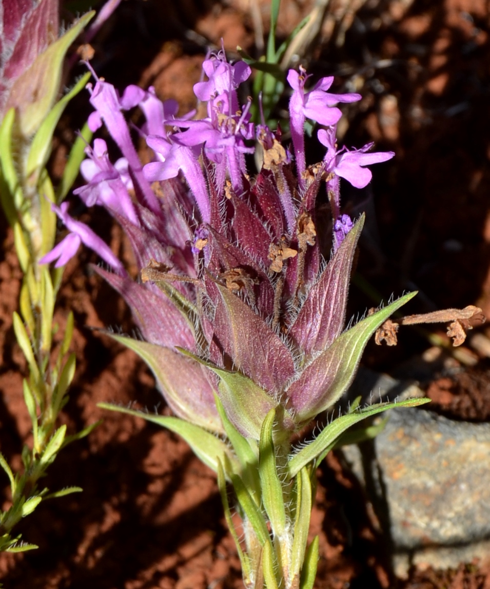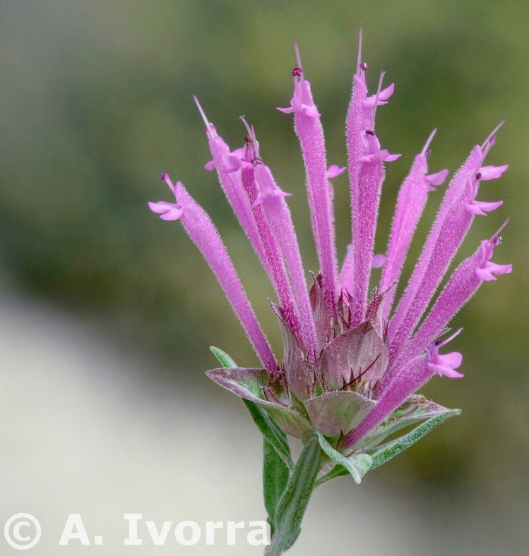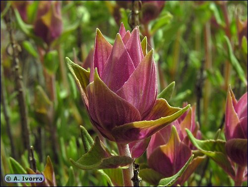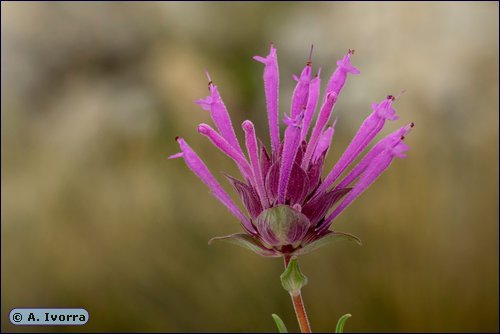 Tragblätter viel breiter als die Blätter, grün oder rotviolett, dünn, 9 - 13 mm lang, 8 - 9 mm breit, spitz, am Rand ohne Wimpern, auf der Unterseite mit deutlichen Adern, Kelch meist hinter den Tragblättern verborgen, 6 - 7 mm lang, mit 3 dreieckigen, nicht bewimperten, ca. 1,5 mm langen oberen Kelchzähnen und 2 pfriemlichen unteren Kelchzähnen