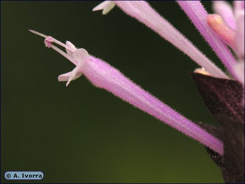 behaart, weit aus dem Kelch ragend, mit sehr kurzen Lippen,
