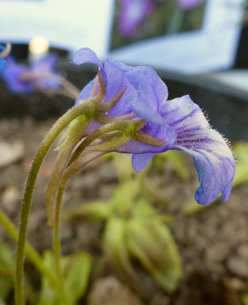 Schaft 60 - 150 mm lang, rund, einblütig, unter der Blüte stark drüsig, im unteren Teil spärlich drüsig Blattrosette mit 5 - 7 Blättern, Blätter homophyll d.h. Frühjahrs- und Sommerblätter elliptisch, dem Untergrund anliegend, Blätter eilanzettlich, 20 - 50 mm lang, 11- 20 mm breit, vorne +/- abgerundet, am Rand +/- nach oben gebogen, obersits stark klebrig Bilden im Winter Hibernakel (= Dauerformen) aus, welche unterirdisch den Winter überdauern