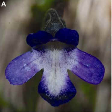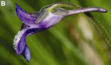meist mit dunkler Aderung Schund weit geöffnet (Winkel zwischen Ober- und Unterlippe 120 - 180 °) Sporn 9 - 11 mm lang, +/- nach unten gekrümmt, mehr als halb so lang wie die übrige Krone, Kronröhre kurz, Kelch drüsig, Kelchoberlippe 3- teilig, Kelchunterlippe 2- teilig, zu 1/2 eingeschnitten