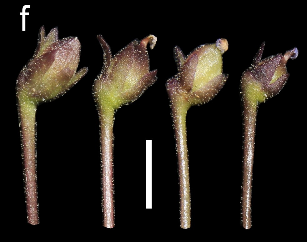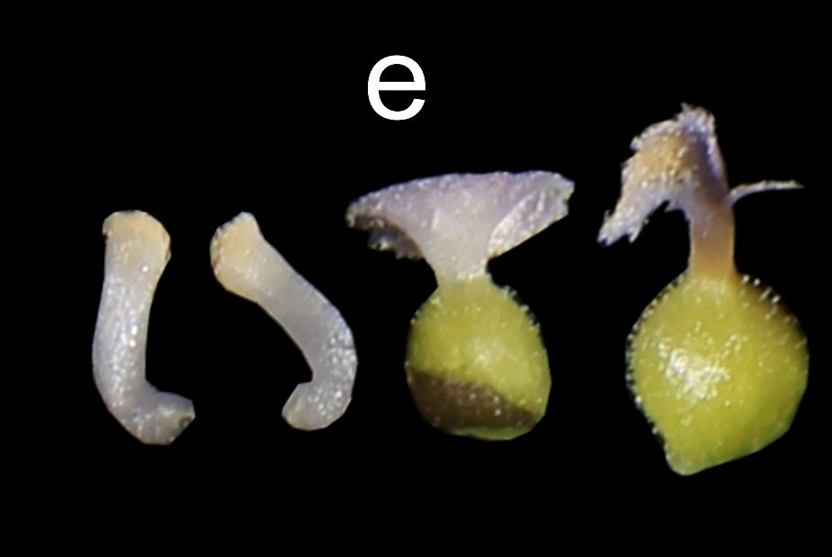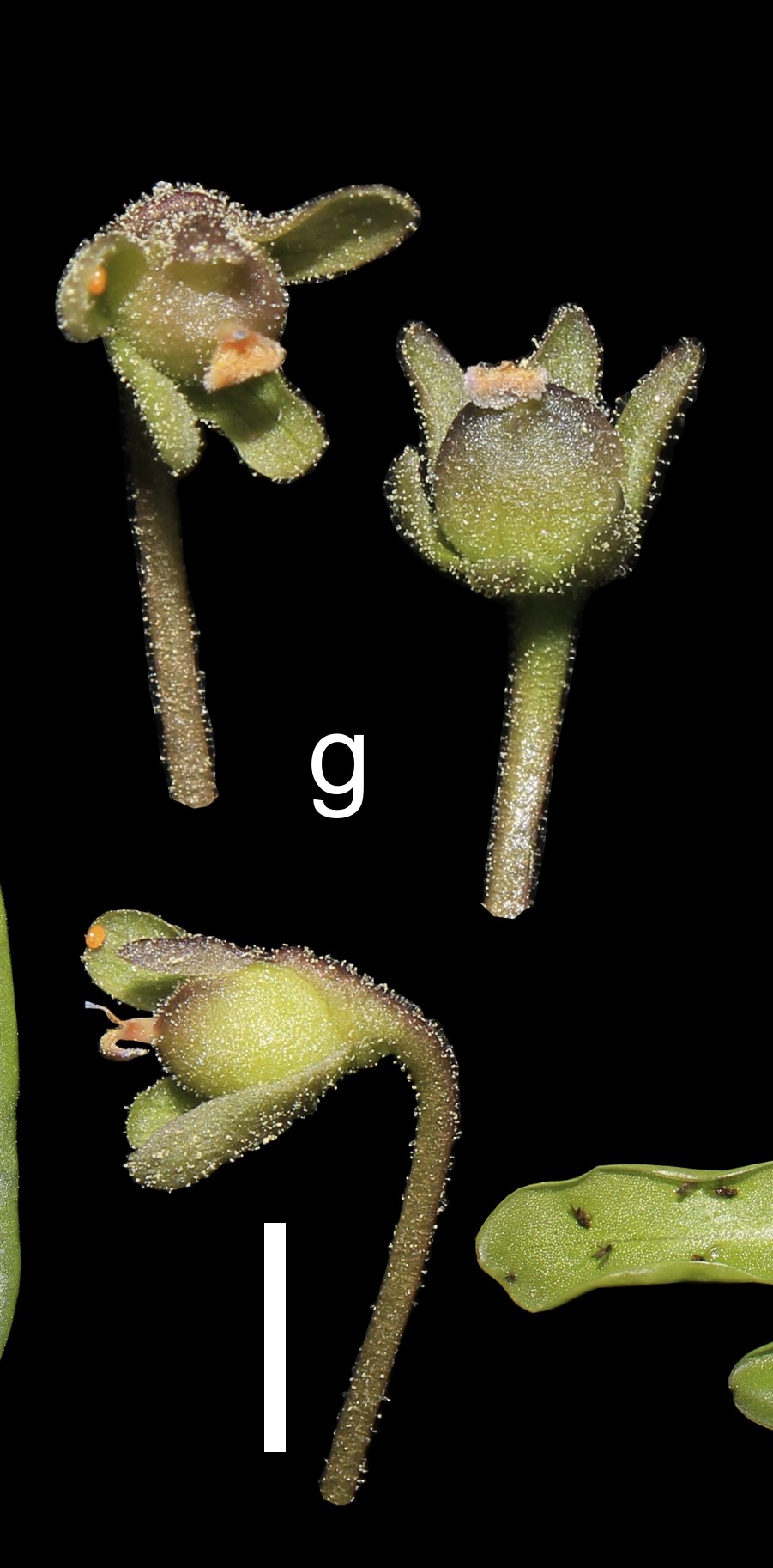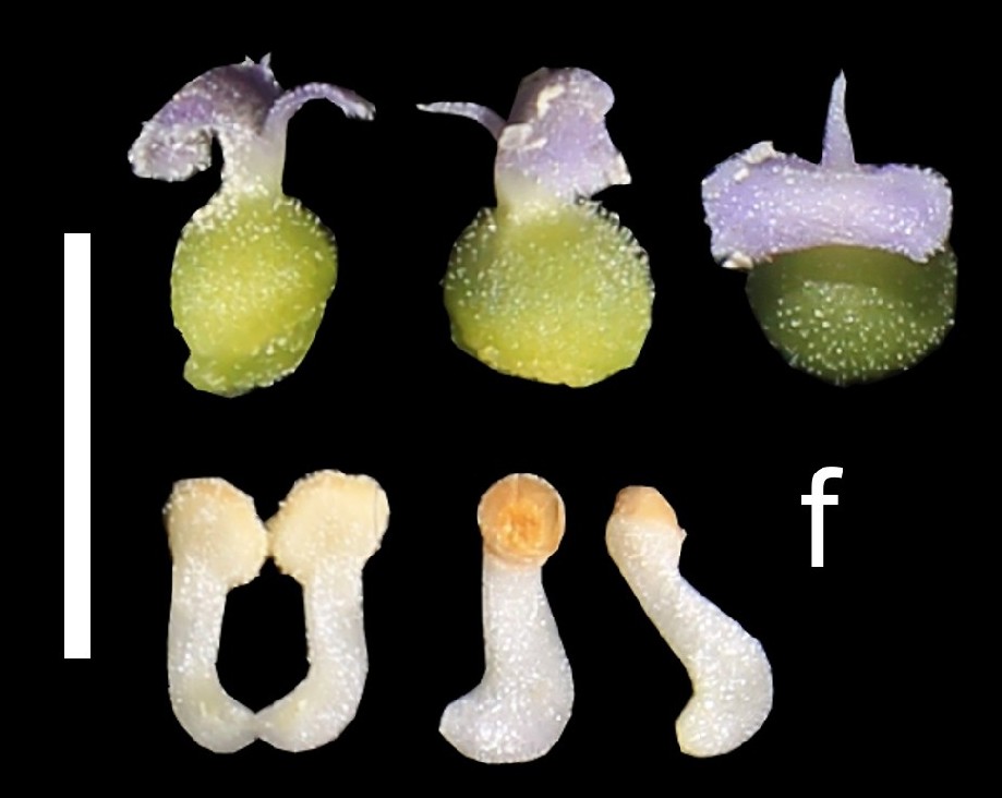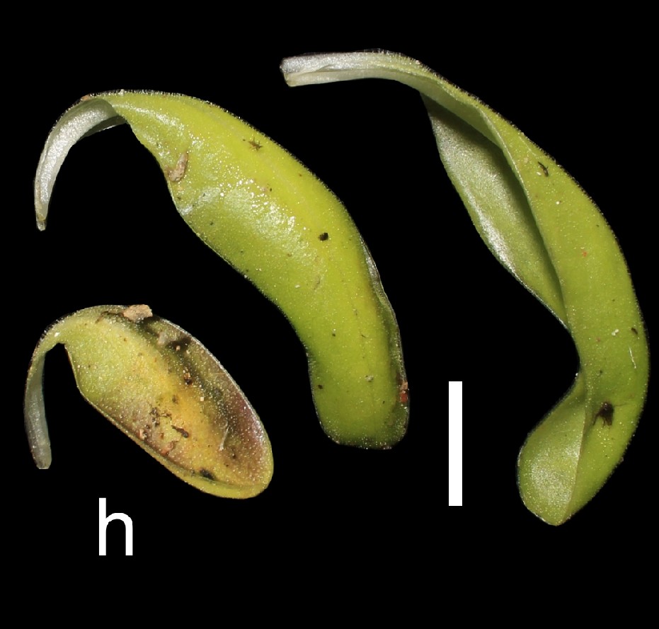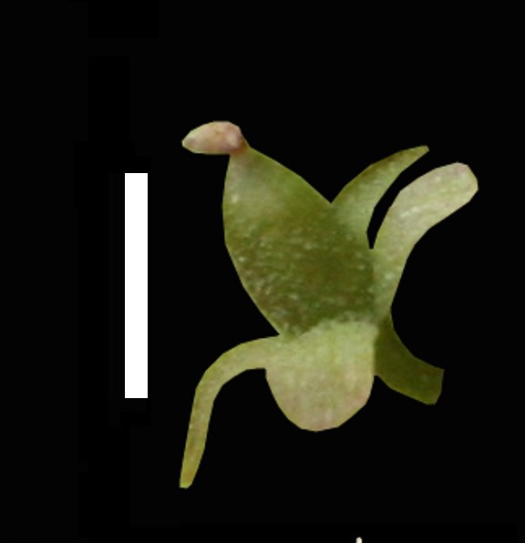 Blüten mit 2 den Fruchtknoten umgebende Staubblätter, Staubfäden ca. 2 mm lang, dick, sichelförmig, Fruchtknoten 1,5 mm lang, mit 2 flächigen, lippenförmigen Narbenästen