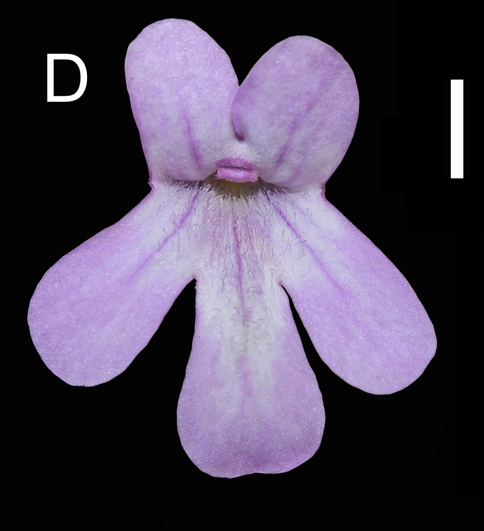 Krone 20 - 30 mm lang (incl. Sporn), weit geöffnet (Öffnungswinkel 120 - 160 °), violett, Oberlippe 2- teilig, mit 2 +/- gleichen, stumpfen Kronlappen, Unterlippe 3- teilig, Kronlappen der Unterlippe deutlich länger als breit, vorne abgerundet, Mittellappen länger als die beiden seitlichen