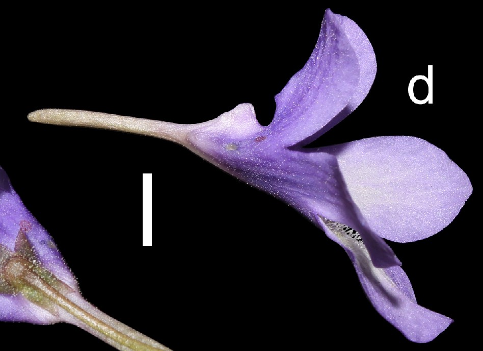 Kronröhre kurz, Sporn 11 - 17 mm lang, gerade oder nach unten gebogen, an der Spitze oft gespalten, mehr als halb so lang wie die übrige Krone