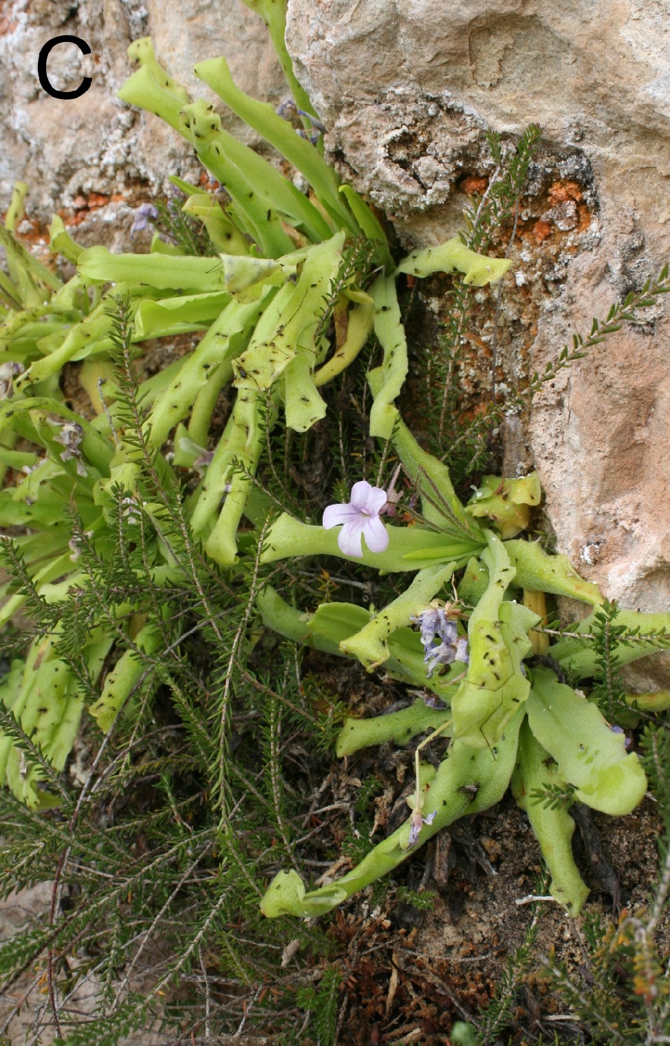 VI- VI, Nasse Felsen, Bachufer (1000 - 1800 m) Synonyme: English name: Weltweite Verbreitung: Etymologie: Pinguicula tejedensis wird beschrieben in der Publikation "Two new calcicolous species of Pinguicula sect. Pinguicula(Lentibulariaceae) growing on rocky habitats of the Iberian Peninsula" (2020) von M.B. Crespo et. al |