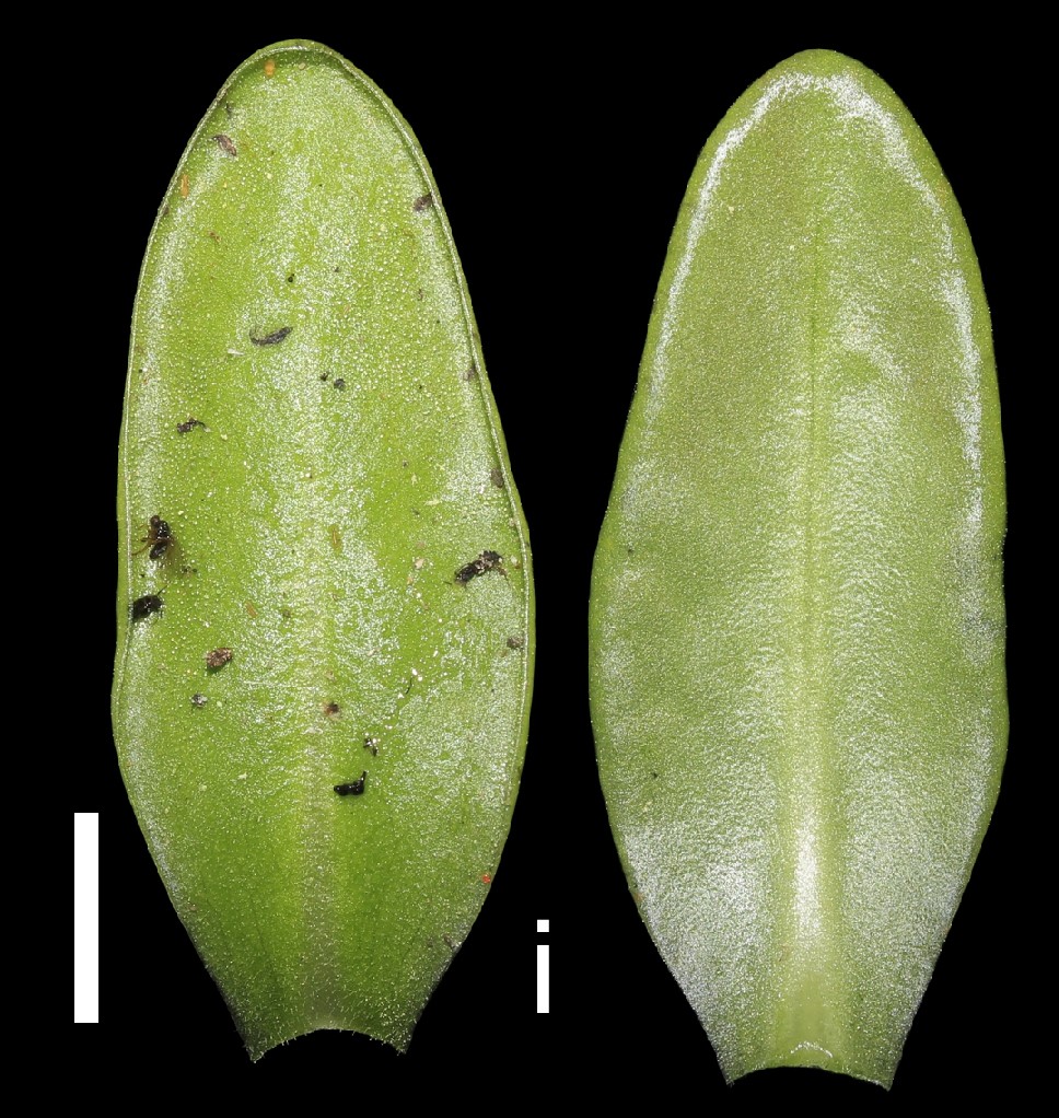 Blattrosette mit 4 - 6 Blättern, Photo und copyright Mario Martinez Azorin Sommerblätter deutlich größer als die Frühjahrsblätter, länglich- elliptisch, +/- aufrecht, vorne stumpf, 65 - 110 mm lang, 8 - 12 mm breit, am Rand kaum gewellt und umgebogen