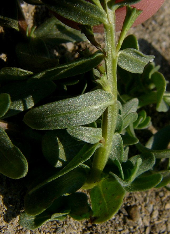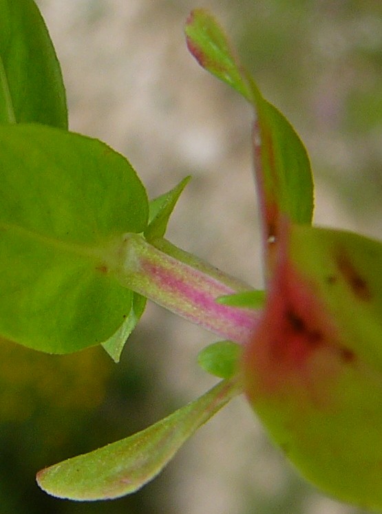 die teilweise aus der Blüte ragen Der Blütenbecher (= Hypanthium = Außenkelch) trägt 6 dreieckige, häutige, ca. 1 mm große Kelchblätter und und 6 zurückgebogenen Zwischenzähne; Blütenbecher keilig, im unteren Teil mit 4 - 7 rote Flecken Obere Blätter linealisch Untere Blätter +/- wechselständig, eilänglich, 8 - 22 mm lang, länger als breit Stängel kantig geflügelt Blätter beiderseits kahl