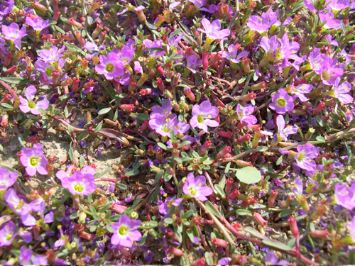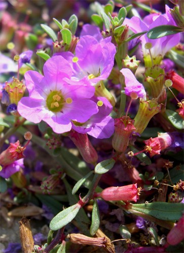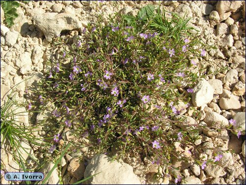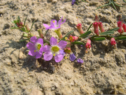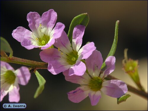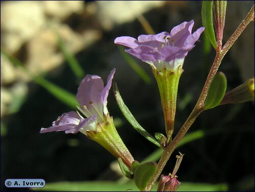 Pflanze 20 - 30 cm groß, Blüten meist einzeln, achselständig, mit 6 Kronblättern Kronblätter rosa, am Grund mit scharf abgesetzter weißer Zone, 3 - 5 mm lang Blüten mit 12 unterschiedlich langen Staubblättern, die teilweise aus der Blüte ragen Blütenbecher ohne rote Flecken, mit 6 deutlichen