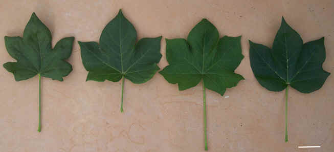 Blätter 5 - 10 cm lang, am Grund herzförmig, 3 - 5 - lappig, breiter als lang, 3 - 8 cm lang gestielt, oberseits sternhaarig, unterseits behaart und auf den Adern filzig