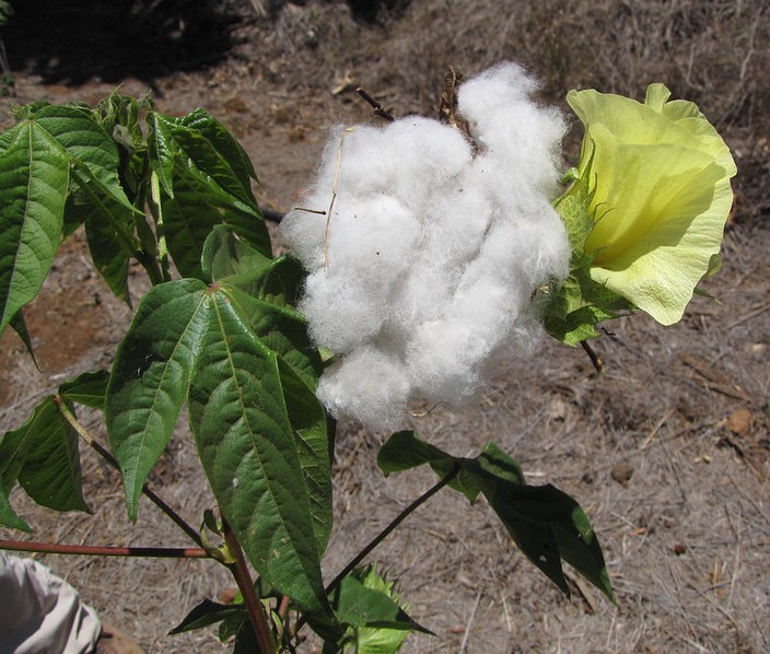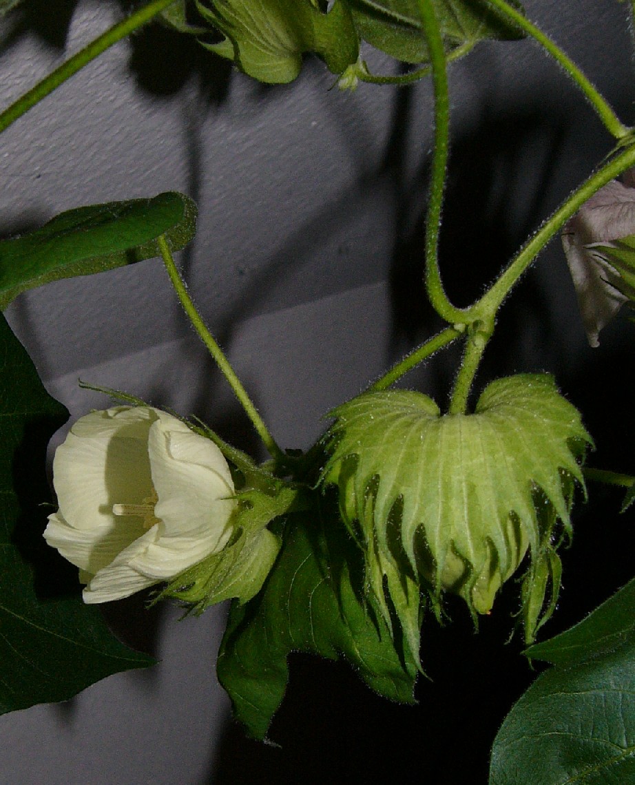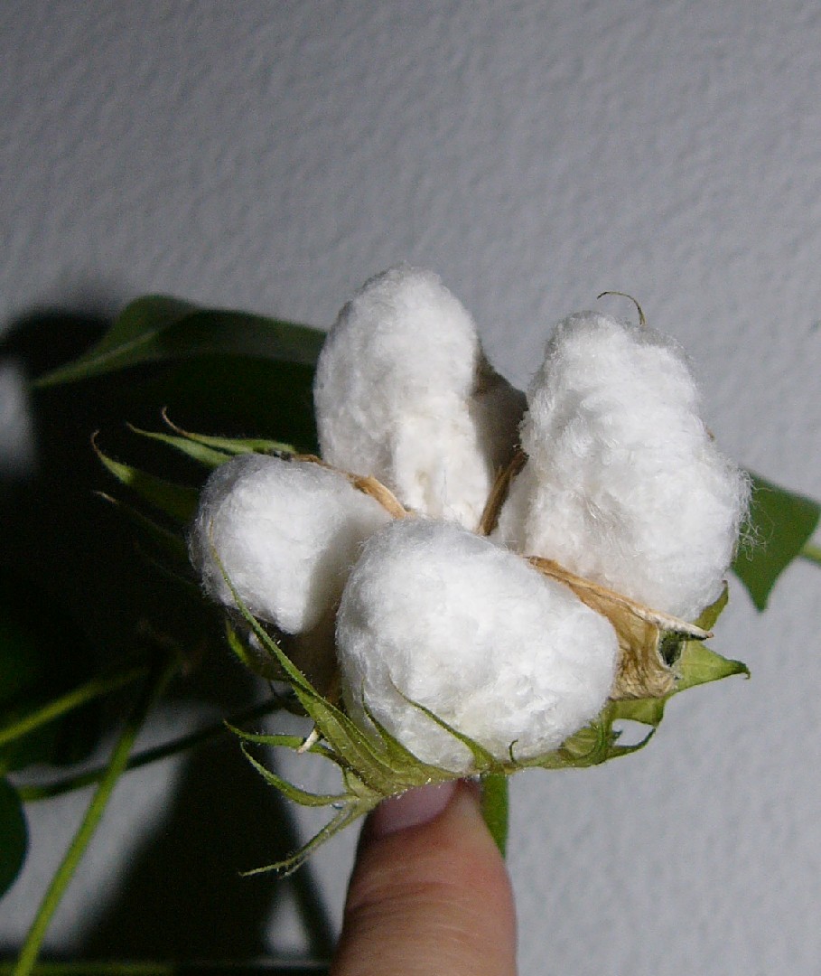 von langen weißen Fasern und hellgrauen, kurzen, fest haftenden Fasern umgeben (= Baumwolle)