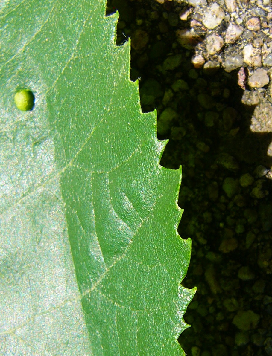 Blattränder gesägt, Blattzähne zur Blattspitze zeigend, ohne Grannenspitze