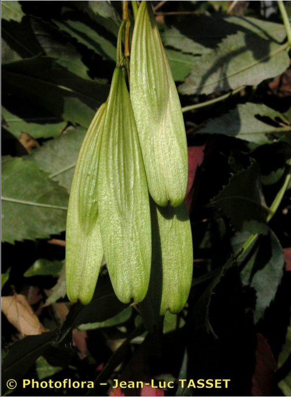 Früchte 20–25 mm lang, 7–9 mm breit, verkehrt-eiförmig bis elliptisch oder lineal-lanzettlich, zugespitzt, selten an Spitze stumpf oder abgerundet; unbehaart