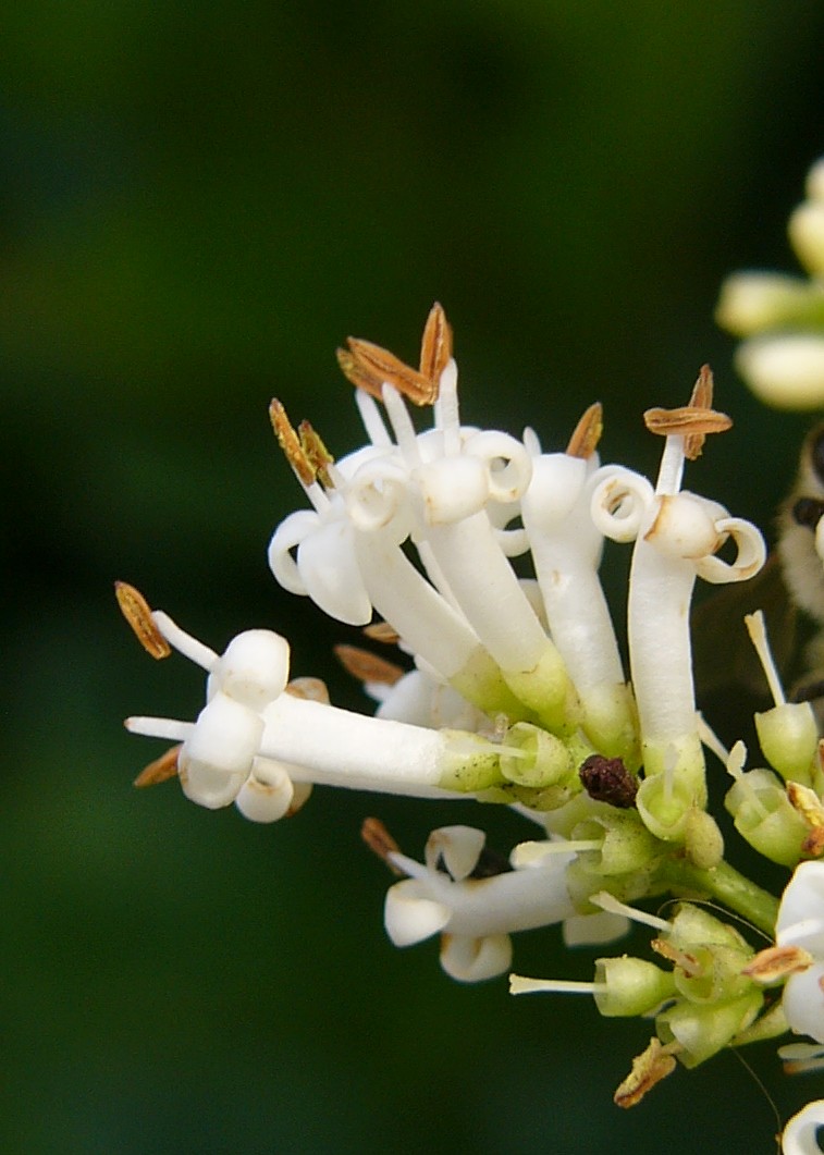 2 - 3 m hoher Strauch Blüten weiß, bis zu 150 in 5 - 10 cm langen Rispen Blüten im unteren Teil zu einer Röhre verwachsen, mit 4 Kronblattzipfeln