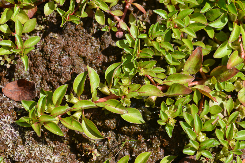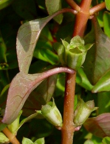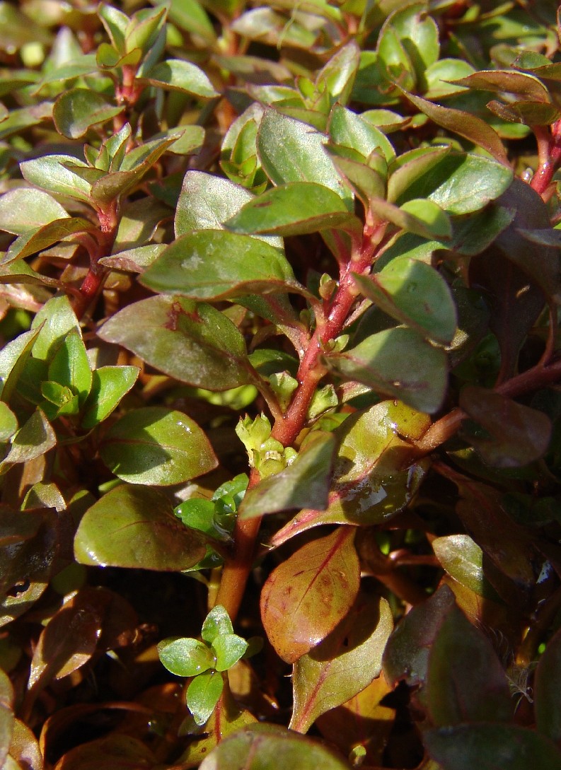 Blätter gegenständig, eiförmig - elliptisch, spitz, oft rot überlaufen, etwas größer als die Blätter von Ludwigia palustris