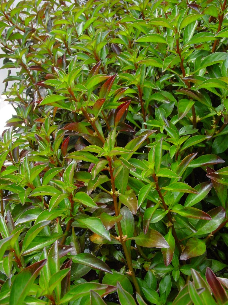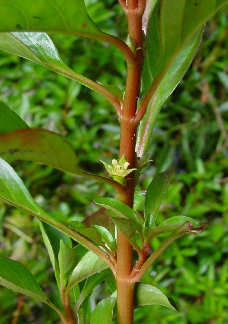 Frucht: 4-kantige, bleichbraune Kapsel Blätter gegenständig, bis 5 cm lang und 2 cm breit, elliptisch bis eiförmig, zugespitzt, am breitesten in der Mitte, dunkelgrün bis bleichrötlich- grün, glänzend, dicklich