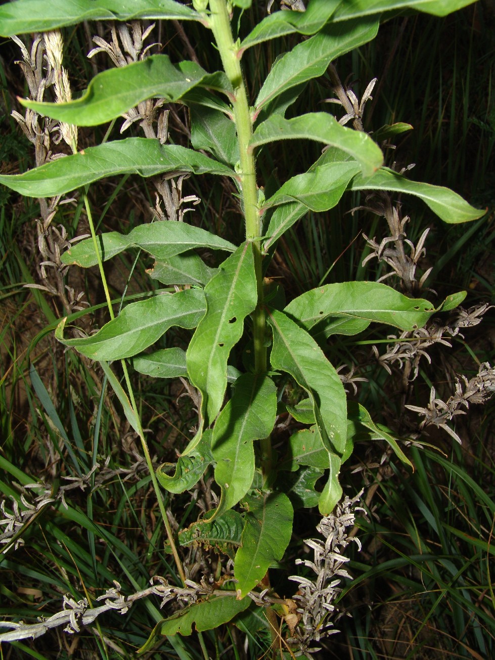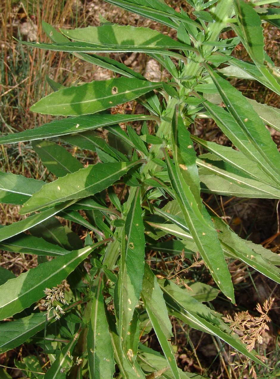 Stängel grün mit kurzen und langen Haaren, nicht rot getupft, Blätter lanzettlich, flach oder etwas wellig, teilweise auch gedreht, schwach gesägt, Mittelnerv zumindest am Grund rot
