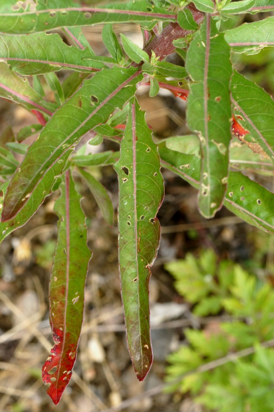 Blätter schmal- lanzettlich, gezähnt, Mittelnerv zumindest am Grund rot