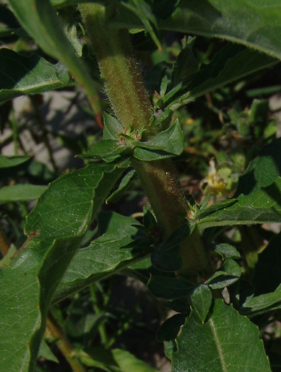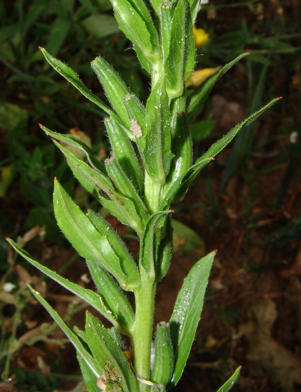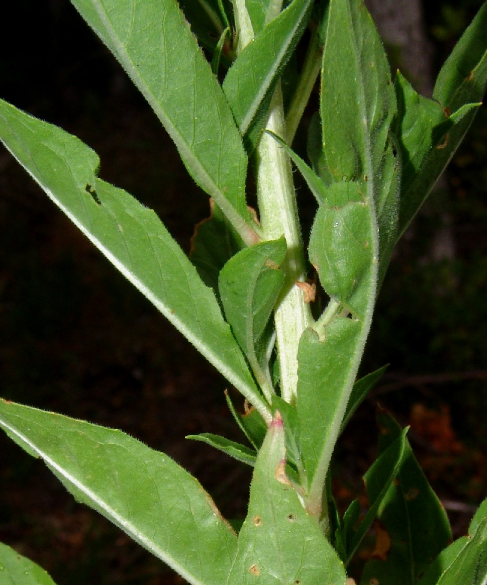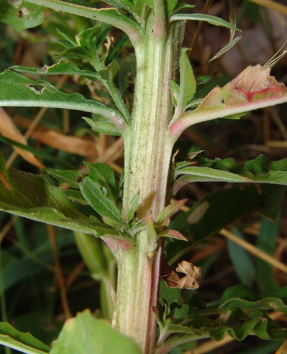 Stängel grün, nicht getupft, unten nur schwach rosa überhaucht, mit kurzen Haaren und Borstenhaaren