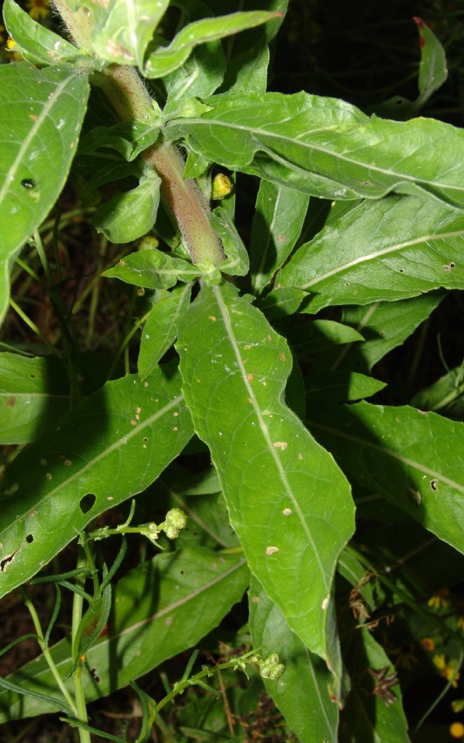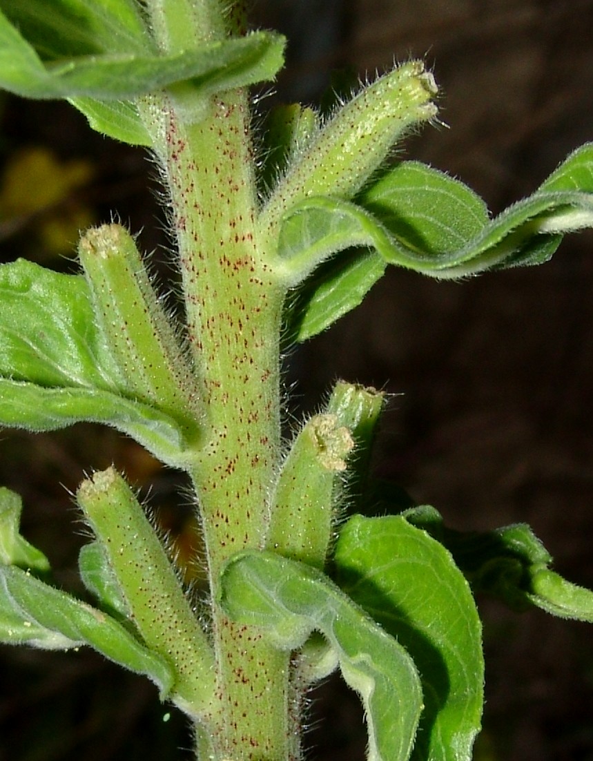 Blütenstandsachse grün, rot getupft, Blütenknospen grün, Blätter breiter 1