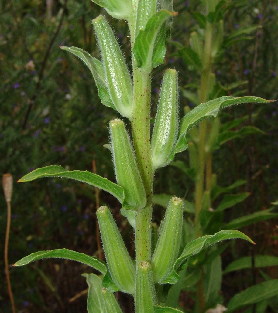 Blütenstandsachse rot getupft, ältere Blütenknospen rot, Knospen und Stängel