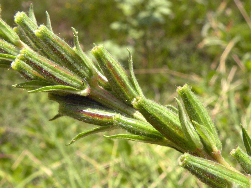 Blütenknospen in der Jugend grün, später rötlich gestreift, drüsig- weißhaarig