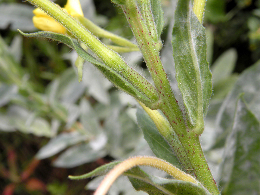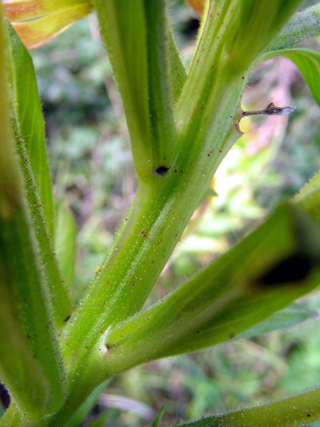 Stängel komplett rot bis dunkelrot, rot punktiert, schwach haarig mit kurzen gekrümmten und langen steifen Haaren