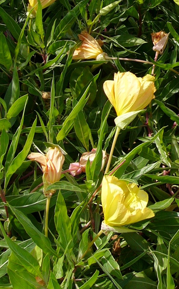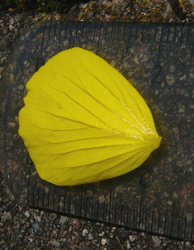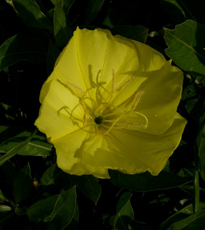 Blüten hellgelb, bis zu 10 cm im Durchmesser, öffnen sich am Nachmittag,