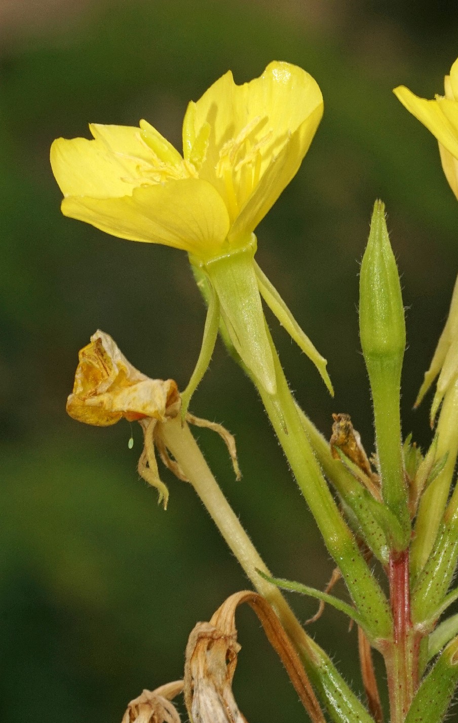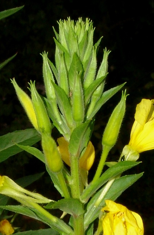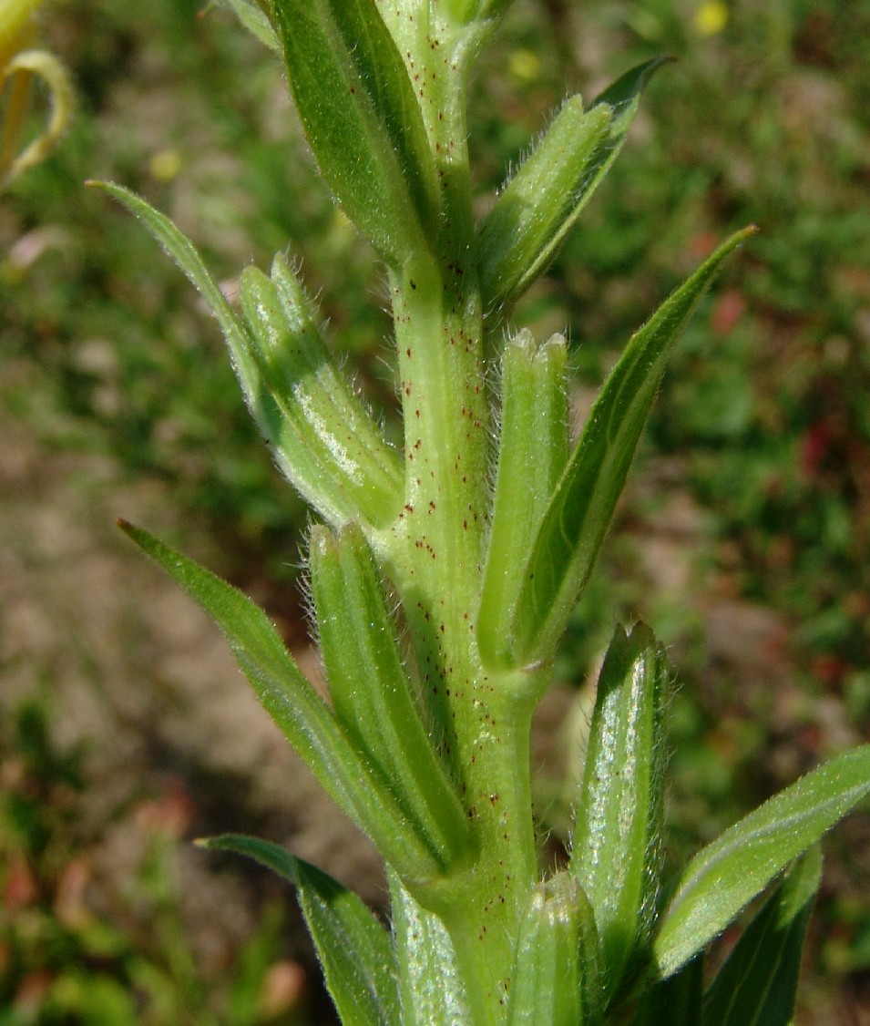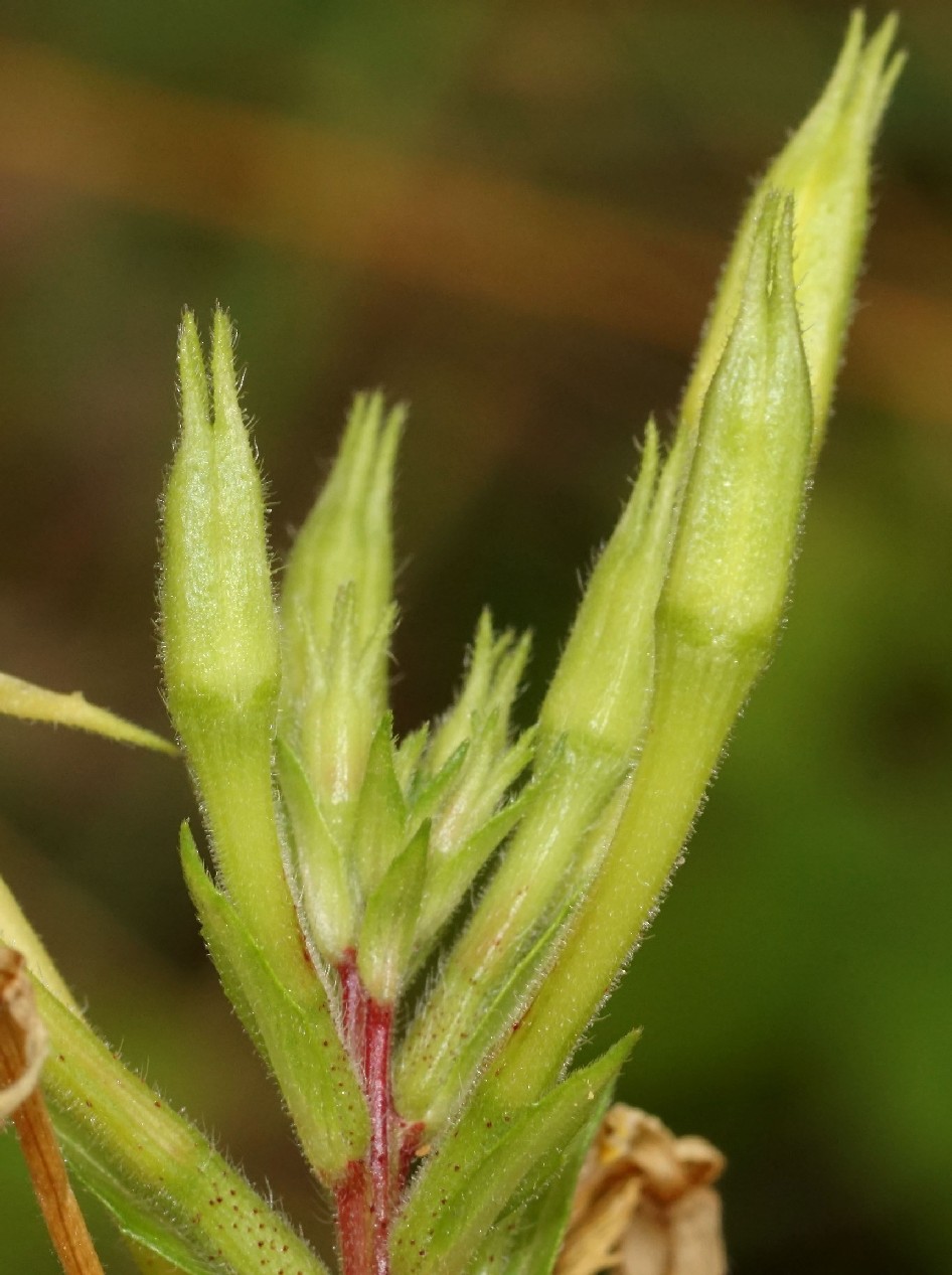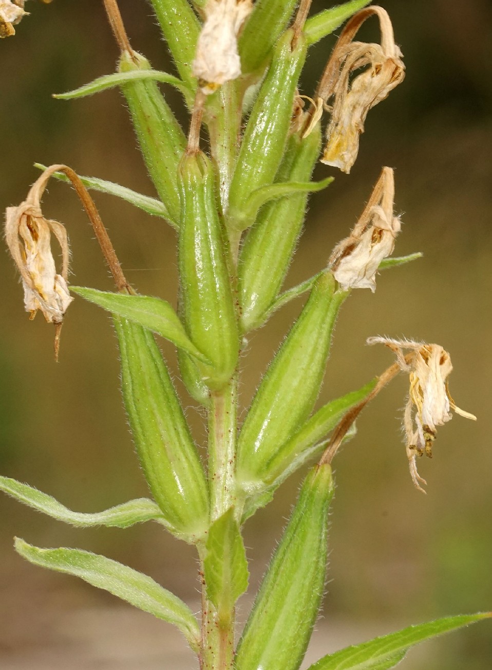 Kapsel 25 - 30 mm lang, deutlich weiß behaart, die oberen mit, die unteren ohne Drüsen, Kapselzähne 3 - 5 mm lang, ein Krönchen bildend d.h. die Kapselzähne spreizend (ähnlich: Oenothera coronifera)