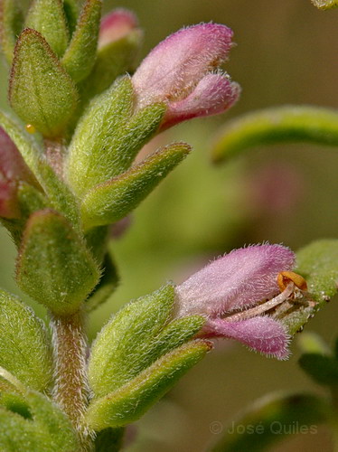 Oberlippe ungeteilt, Unterlippe bis über die Hälfte in 3 +/- gleich große Zipfel geteilt, Mittelzipfel vorne kaum verbreitert, Griffel in die Krone eingeschlossen, bis zur Narbe behaart, Kelch 4 - 5 mm lang, behaart, mit 4 Zähnen, Kelchzähne breit dreieckig, etwas kürzer als die Kelchröhre