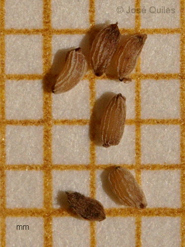Samen 1,2 mm lang, 0,7 mm breit, längs gerippt