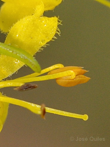 Krone gelb, 6 - 8 mm im Durchmesser, außen behaart, mit 4 weit aus der Blüte ragenden Staubblättern, Unterlippe 3- zipflig