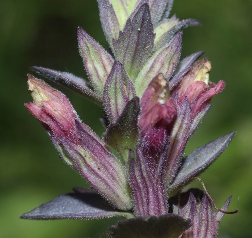 Blüten dunkelviolett, Stängel drüsig, Tragblätter eiförmig, gezähnt > Bartsia alpina |